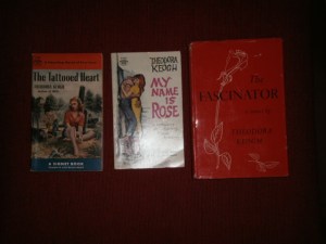 Theodora Keogh is my latest literary obsession, so I’ve been buying her out-of-print books on amazon.com as I find them (several of her novels have been reprinted by Olympia Press, thus I have been focusing on acquiring the out-of-print ones first). I love the look of old pulp fiction, and these editions are still in good condition because Signet was smart enough to produce them with colored page edges (I’m sure there is a technical term for this, but I don’t know it, which is terrible) to help protect the pages. I remember my elementary school librarian, Charles Kolataze at P.S. 97 in the Bronx, teaching us that books with this feature would last for years and years, but books without it would maybe only last for ten. Now, it is ridiculous to say that any book, even one being handled often by grubby children’s hands, will only last for ten years–see Nicholson Baker’s excellent exposé of this and other ridiculous librarian myths, Double Fold: Libraries and the Assault on Paper–but it is true that books with protected edges stay in good condition.