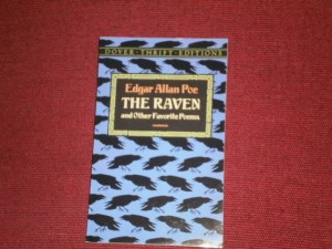 A third strong Poe memory comes from the tail end of my sophomore year of high school. I was in Stratford, Ontario on a school trip to the Stratford Shakespeare Festival (which was a surreal experience, but that is a story for another post). The plays were in the evening, thus we were spending the day browsing Stratford’s shops. I came across a small bookstore and decided to go inside and look for a collection of Poe’s poetry. (Why Poe? Why poetry? I don’t remember my reasons; it was like an unexplainable craving.) This is the earliest instance I can remember of that lovely phenomenon of going into a bookstore wanting a specific book and finding it when you were not sure that you would (Sinclair Lewis’s Main Street and Evelyn Waugh’s Brideshead Revisited are two other examples of this happy synchronicity that I have experienced). In this case, I didn’t even know whether the book I wanted even existed, but there it was, “The Raven” and Other Favorite Poems, for only $1.00.