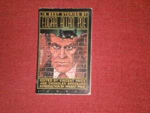 The second encounter with Poe which comes to mind is reading a book of his short stories for eighth-grade English. The stories were cool because of their creepiness, but I got a 72 (or maybe a 74? Anyway, pretty abysmal) percent on the exam that covered them, so didn’t revisit the book for years afterward because it was associated with bad memories. However, I still have it, and just now noticed that it is edited by Vincent Price! Classic. And only $4.95 new.