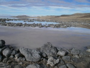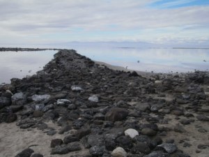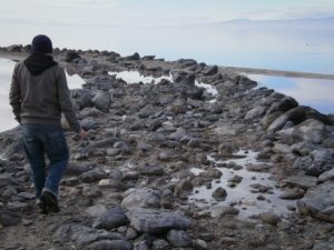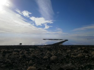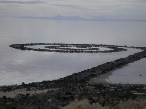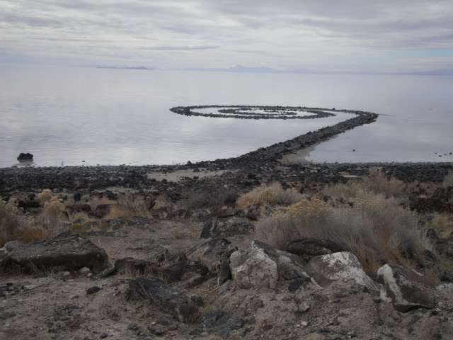Today with three friends I visited Robert Smithson’s Spiral Jetty, a piece of land art near Corinne, Utah, that was built on the shore of the Great Salt Lake in 1970. It was an amazing experience! I had seen numerous pictures of the Jetty in art history textbooks, but it was wonderful to get to experience it for myself. The scenery surrounding the piece is beautiful (the sky is amazing in many of the photographs below), though it is made even more sublime by the presence of Smithson’s work, which is made out of natural materials while simultaneously epitomizing the artificial. The Jetty would still be a fascinating landscape if it had somehow appeared organically out of the lake, but I appreciate it more because it is, in fact, an intentional something, because it is art, because it is artificial. It makes the lake–which is impressive-sounding until you actually see it and realize that it is this weird, uncategorizable entity of liquid death, neither lake nor sea–more interesting. It is in the lake, but not of it. Anyone who has the chance to see it should. It is a worthwhile trip, one of the most exciting things I’ve done in years.