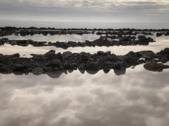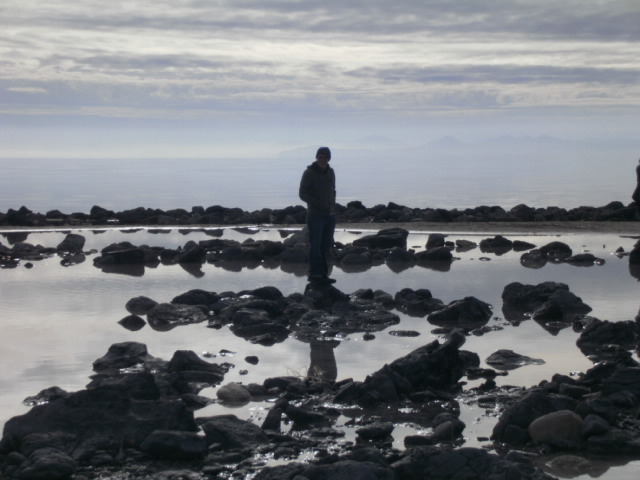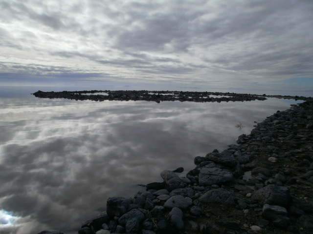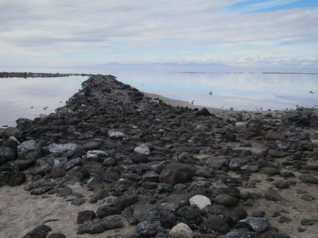 What follows are some selected photographs of the Jetty that I took while exploring it. They move in chronological order from arriving in the small parking lot just above the piece through walking onto the Jetty and around it to the extent possible (the innermost swirl was enough underwater to be unwalkable, though it was still visible) to walking back toward the parking lot. At the beginning of the day it was overcast, but several hours later when we returned to the car it was wonderfully sunny, as can be seen in the final photograph.