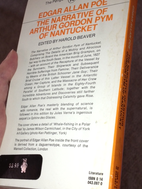 I have been on the lookout for a copy of this novel for two reasons: 1. a colleague of mine recently told me that it was one of the most influential books on her life, and 2. I taught some of Poe’s short stories this past semester, and decided that it would be helpful for me to read his only novel in support of this teaching in future courses. I was especially excited to find the Penguin edition because of my love for Penguin paperbacks.