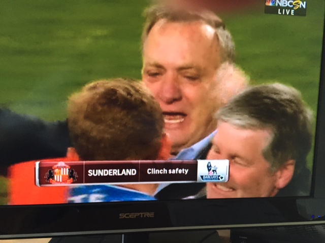 I took the above photograph at the end of Sunderland’s 0-0 draw at Arsenal yesterday afternoon, which ensured that the Black Cats are safe from relegation this season. The caption, “Clinch safety,” is a simple statement within the context of the match, but it also struck me as a profound statement about life. Isn’t that what we all want, to be assured that we are safe, not just physically, but emotionally as well? It’s such a basic, plain graphic, but it was on the screen for at least five minutes, and I think the moment I happened to photograph it, which shows Sunderland manager Dick Advocaat crying with happiness, epitomizes its deeper significance. We watch sports to help us try to escape from the stresses of life (even though they often cause us more stress) because we always know that true safety is never really assured.