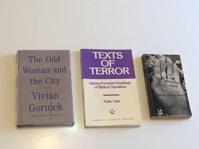 I haven’t read Gornick’s work before, but I read a review of this memoir about her walks exploring New York City and ordered it immediately afterward because I have been getting more and more interested in walking as a political and literary act. One notices so much more when walking than when driving a car, or even riding a bike. I must also say that the book itself is very aesthetically pleasing (as books published by FSG tend to be). It and Trible’s book were purchased from amazon.com’s network of independent booksellers.